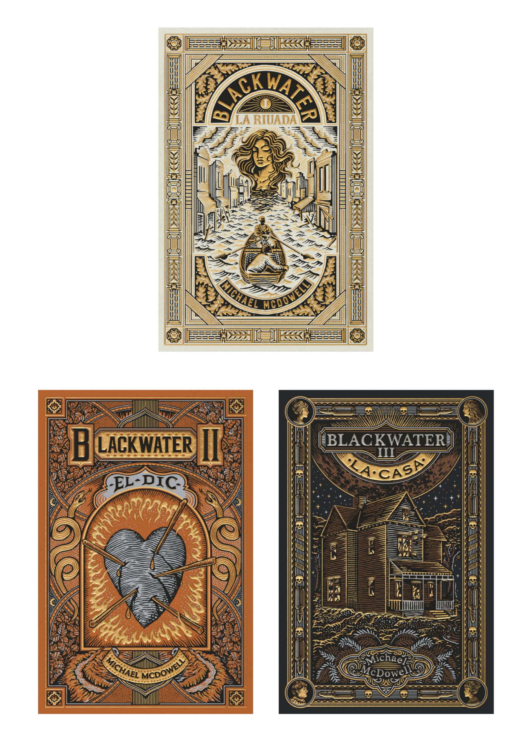Prevenda dels tres primers volums de la saga Blackwater: La riuada, El dicLa casa amb punt de llibre i postal d’Alabama.