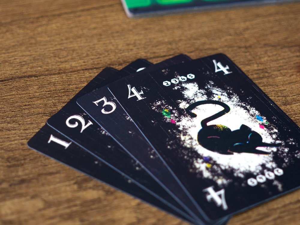Cat in the Box no es un juego de bazas cualquiera, ya que anuncias el color de cada carta únicamente al jugarla. Sin embargo, cada combinación de número y color solo se puede jugar 1 vez. Así que ten cuidado: si no puedes jugar más cartas, causarás una paradoja y perderás puntos y ¡seria CATastrófico!