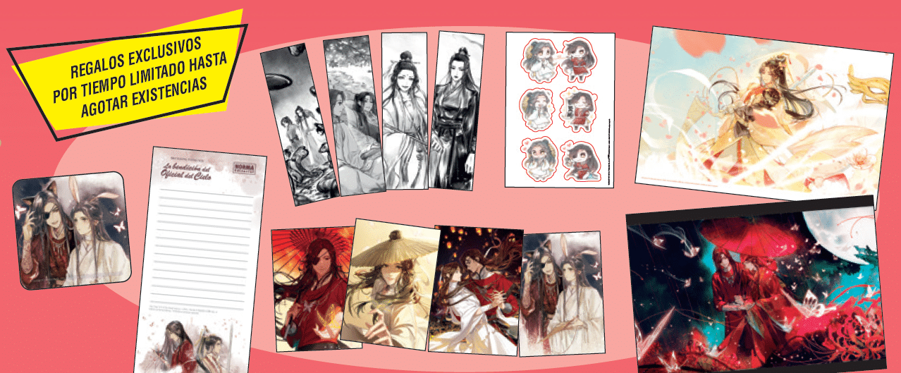 Ambas ediciones de La Bendición del Oficial del Cielo cuentan con ilustraciones a color, ilustraciones en blanco y negro, ficha de personajes y glosario. Esta edición viene acompañada de productos exclusivos y limitados. Estos productos no volverán a reimprimirse una vez se agote la primera edición, por lo que ¡no dudes en hacerte con esta edición!