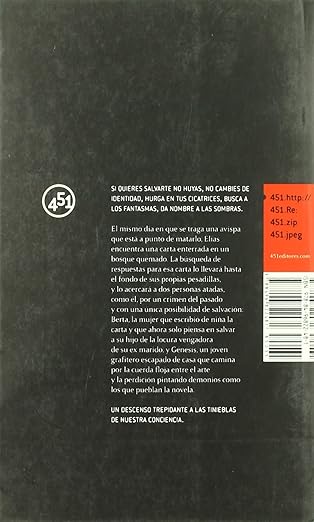 El mismo día en que se traga una avispa que está a punto de matarlo, Elías encuentra una carta enterrada en un bosque quemado. La búsqueda de respuestas para esa carta lo llevará hasta el fondo de sus propias pesadillas, y lo acercará a dos personas atadas, como él, por un crimen del pasado y con una única posibilidad de salvación: Berta, la mujer que escribió de niña la carta y que ahora solo piensa en salvar a su hijo de la locura vengadora de su ex marido, y Génesis, un joven grafitero escapado de casa que camina por la cuerda floja entre el arte y la perdición pintando demonios como los que pueblan la novela